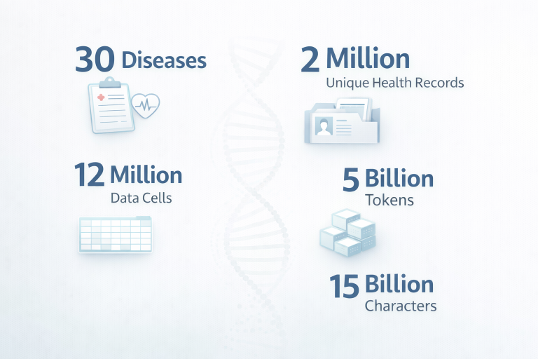 Our Solution: 100% Synthetic, longitudinal clinical data that replicates real-world disease patterns without privacy risk.